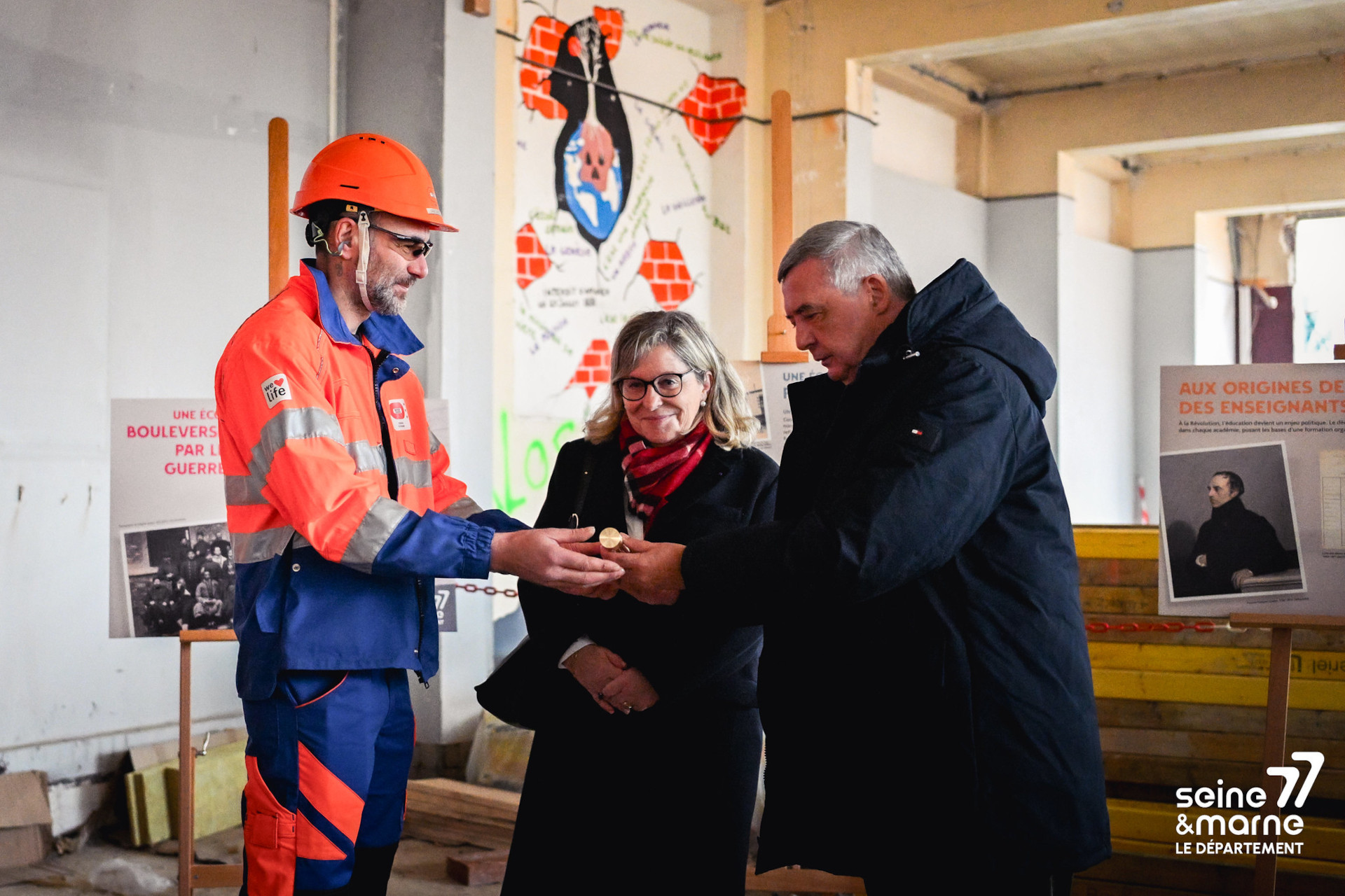 Cette lettre a été remise par les ouvriers au Président du Département de Seine-et-Marne, Jean-François Parigi, le 12 décembre 2025. Ce document historique sera conservé aux archives départementales. Lors de la cérémonie de la pose de la première pierre, les compagnons du chantier ont offert un moment d’émotion en lisant leur lettre de réponse.