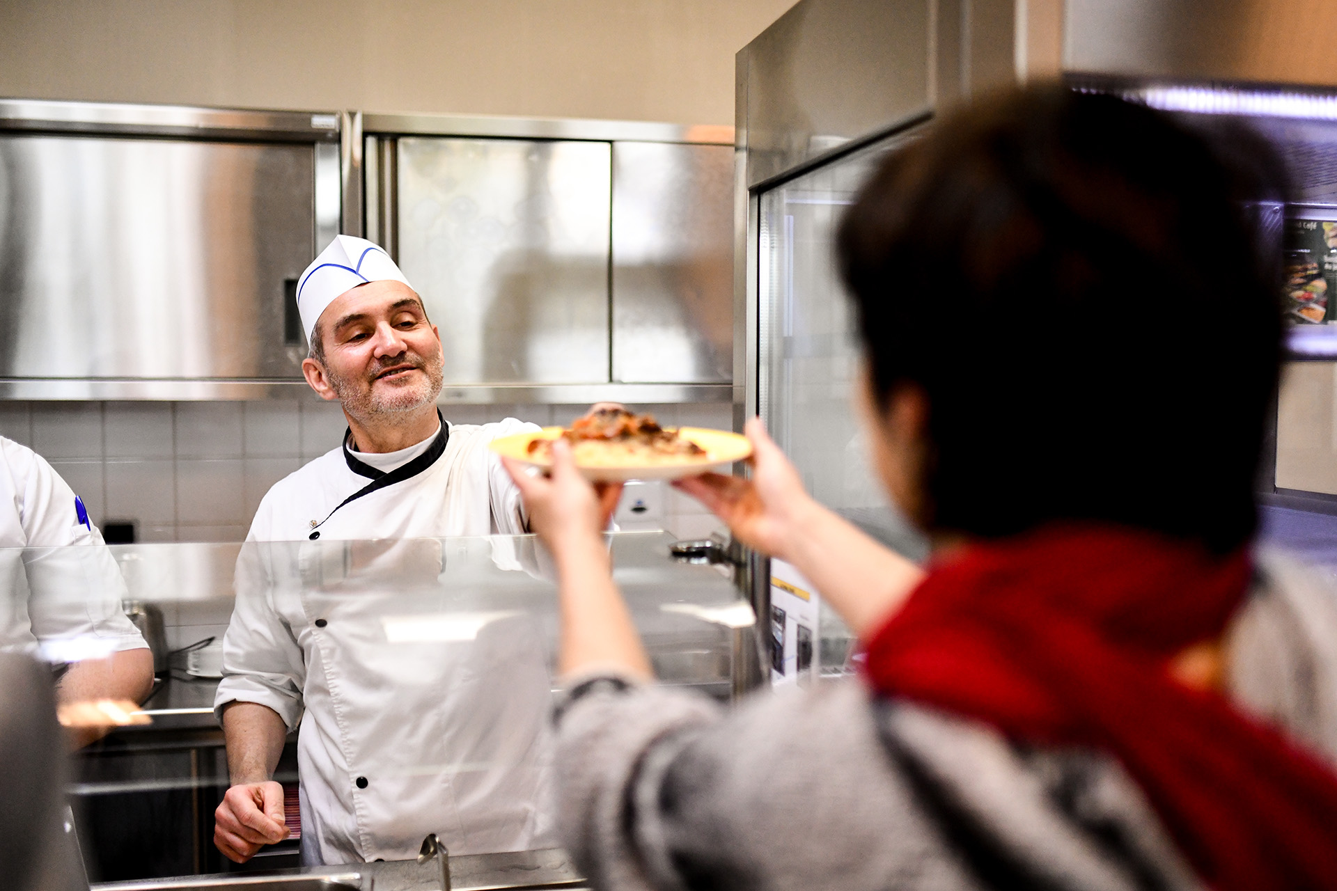 Un cuisinier sert un plat à la cantine